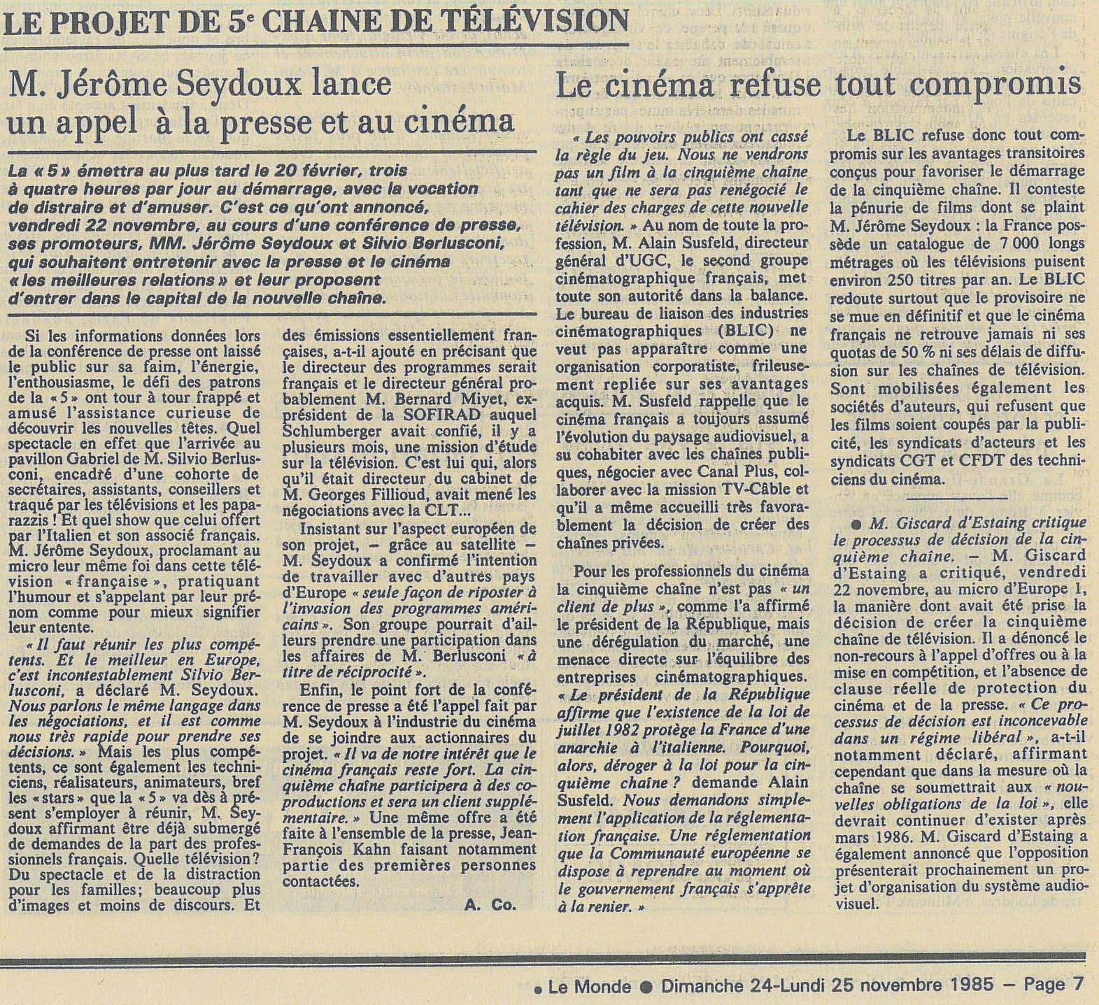 (article du journal Le Monde des dimanche 24 et lundi 25 novembre 1985)