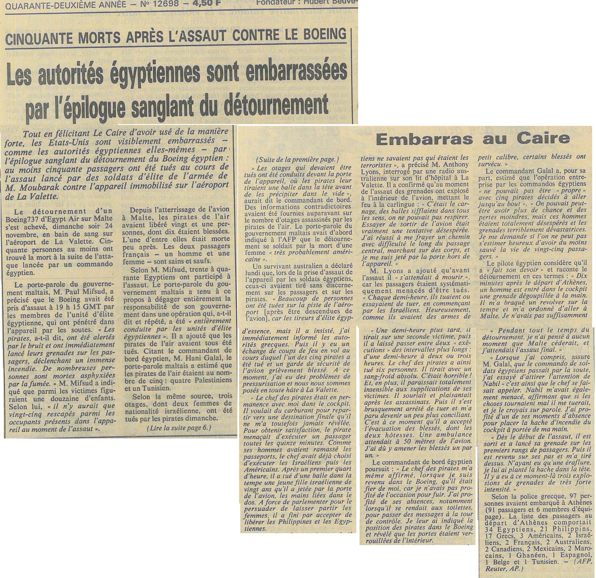 Le dimanche 24, un commando égyptien de la Saïka (corps d’élite) ordonne l’assaut… C’est le début du carnage qui verra périr 61 personnes. Les terroristes se revendiqueront tout d’abord de l’organisation Révolution égyptienne, mais il s’agira bien, au final, de membres d’Abou Nidal.
