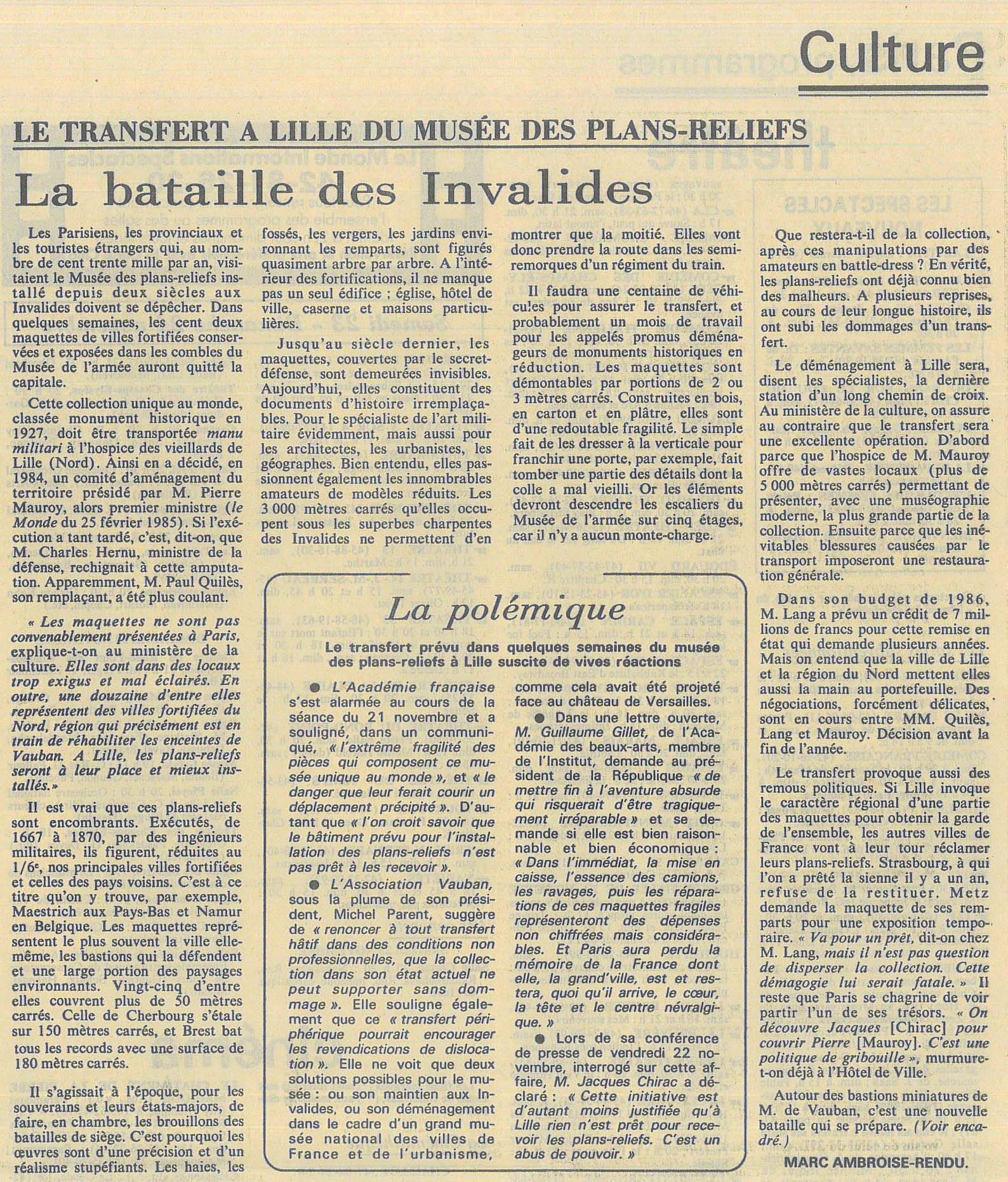 Le transfert soulève une vive polémique attisée par le contexte de campagne électorale des législatives de 1986, et dès le changement de majorité, son principe est remis en cause par le nouveau gouvernement. François Léotard, nouveau Ministre de la culture, interrompt le déménagement. Le conflit se dénoue par une convention conclue le 2 octobre 1987 entre l’Etat et la Ville de Lille. Ce sont finalement 16 plans-reliefs qui son concédés à Lille, les autres étant rapatriées à Paris.